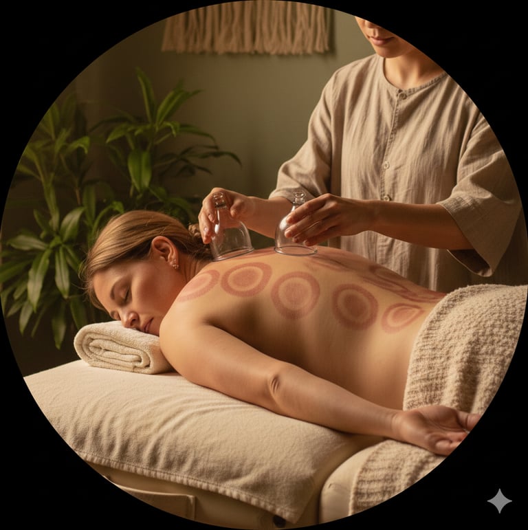 Cupping therapy involves the application of suction cups to targeted areas to promote blood flow, reduce muscle tightness, and support tissue recovery.